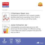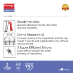 Prestige 750 Watts Prism Mixer Grinder with 3 Stainless Steel Jars| LED Power Indicator|Flow Breaker Design|Sturdy Handles| Purple and White