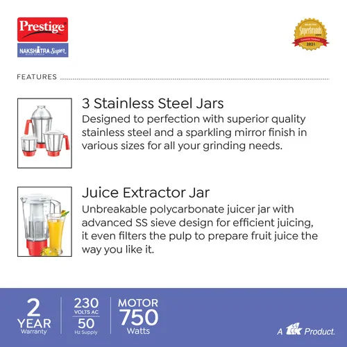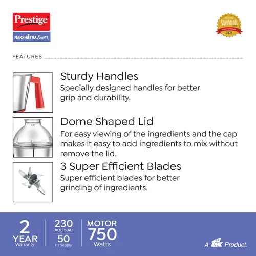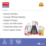 Prestige 750 Watts Nakshatra Super Mixer Grinder with 4 Jars (3 Stainless Steel Jars + 1 Juicer Jar)| Sturdy Handles| Juicer Jar with Sieve|Red and Black