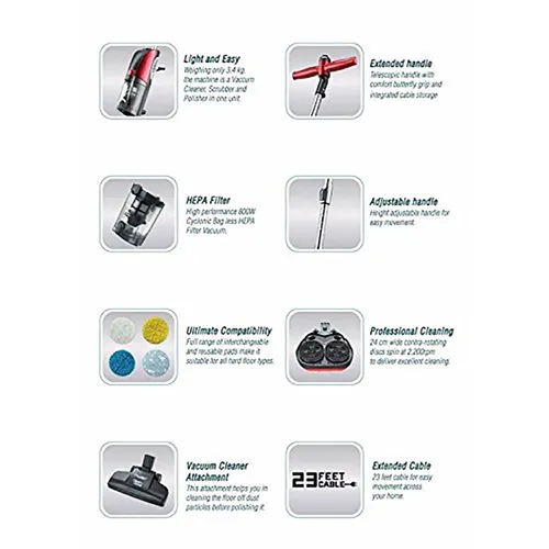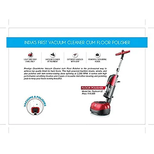 Prestige CleanHome Floor Polisher Cum Vacuum Cleaner is the professional way to achieve top quality finish for your hard floors. This high powered machine cleans, scrubs and also polishes with twin contra-rotating discs spinning at 2200 rpm. Along with a built-in vacuum cleaner, this floor polisher also comes with 3 pairs of reusable microfiber cleaning and polishing pads to keep your hard floor looking beautiful for years.