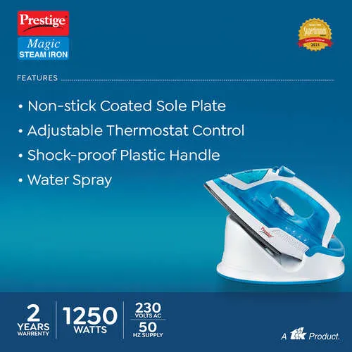 Prestige Magic Steam Irons, a quality range from TTK Prestige Limited. Prestige presents Magic, a range of Steam Irons with advanced features and aerodynamic styling, which will take your heart away! TTK Prestige has been the leading manufacturer of kitchen appliances in India for the past 60 years, and has been renowned for it’s product innovations and quality. With Magic Steam Iron, Prestige promises that every use is an experience worth savouring and remembering. Go ahead and feel the Magic!
