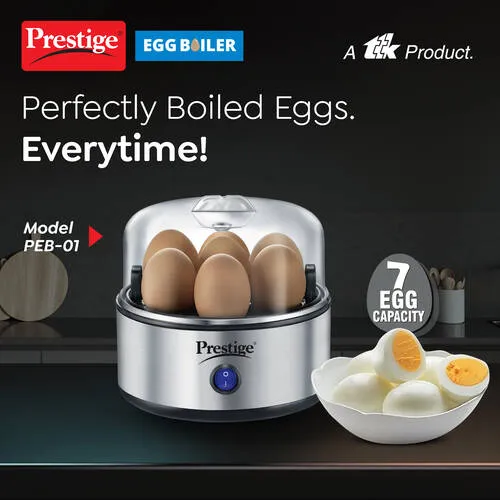 Prestige PEB 01 Egg Boiler (7 Egg Capacity)| 3 Boiling Modes| Auto- Switch Off| Stainless Steel Body|One Touch Operation| Customizable Boiling Level| Measuring Cup Inside| 7 Eggs at a Time|Silver