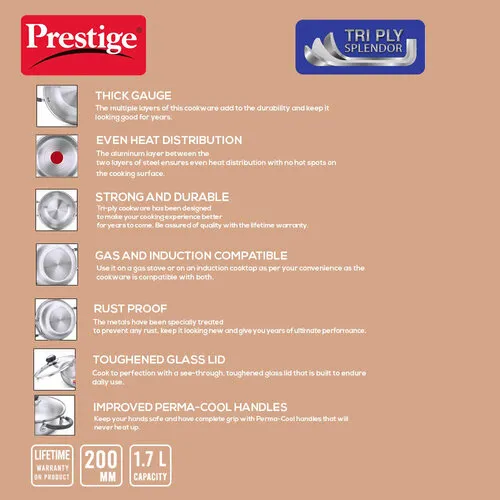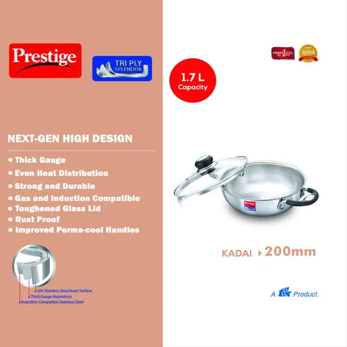 Prestige Tri Ply Splendor Stainless Steel Gas and Induction Compatible Kadai with Glass Lid (Silver)